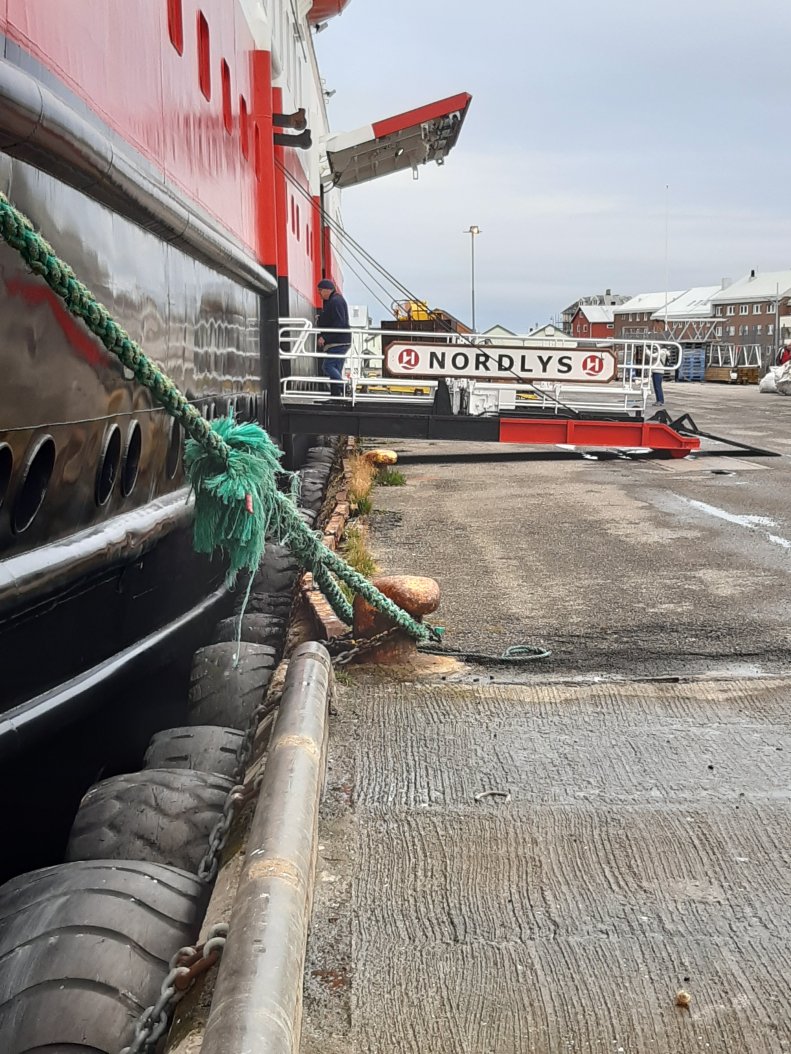 And its raining here, grey and windy, as we round the top of Europe on our lovely graceful ship. I love the way that such a big, modern vessel is nonetheless tethered in port by a couple of ropes round a bollard, and that it’s old tractor tyres that are used to fend her off the quay, and I love the way she slips backwards and turns to head back out to sea afterwards.